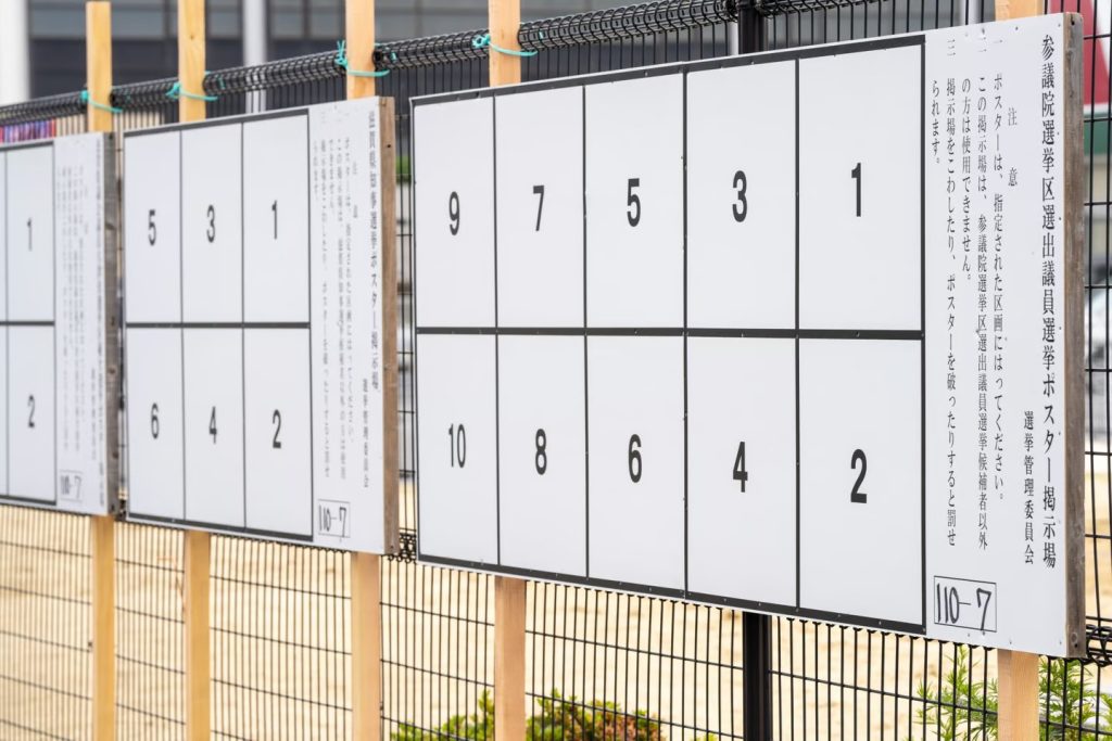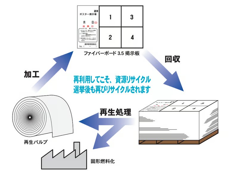 選挙後に回収されたポスター掲示板はリサイクルされ再利用されます。環境に配慮した掲示板です